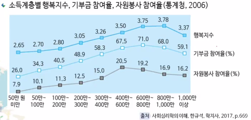 -돈은 가난 수준을 벗어나서 의식주와 질병치료 같은 기본적 욕구를 충족시킬 때까지만 행복 수준에 영향을 미침
